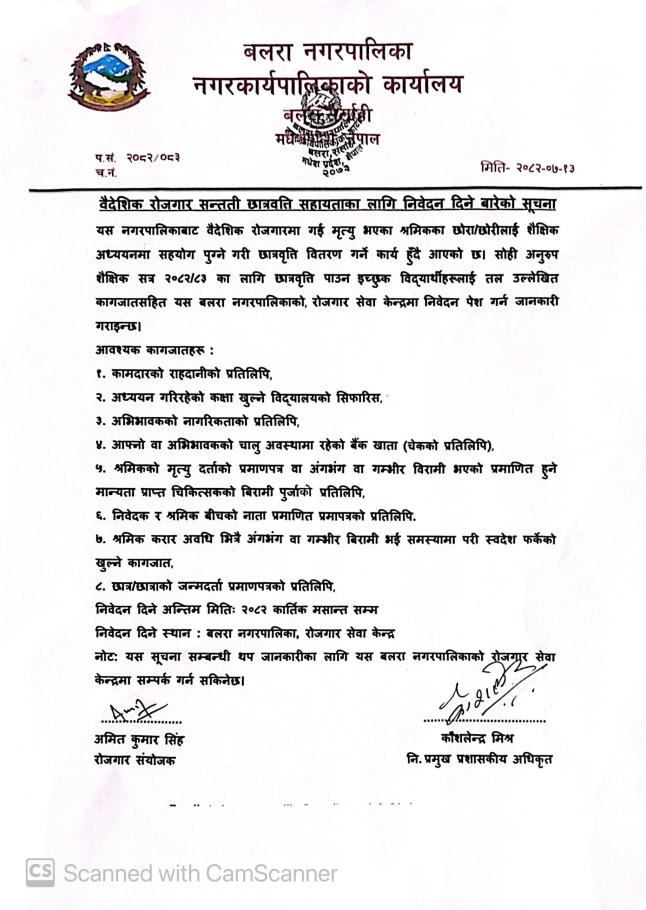» वैदेशिक रोजगार सन्तती छात्रवत्ति सहायताका लागि निवेदन दिने बारेको सूचना