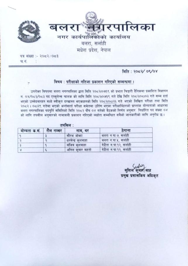 एम्बुलेन्स चालक पदको अन्तिम नतिजा प्रकाशन सम्बन्धी सूचना