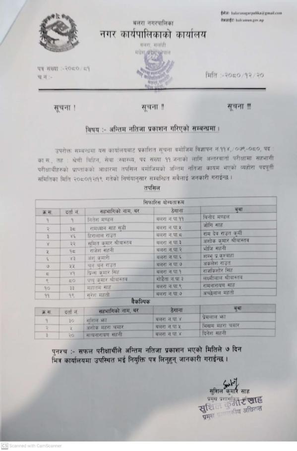 पद का.स. सेवा स्वास्थय को अन्तिम नतिजा प्रकाशन गरीएको सूचना
