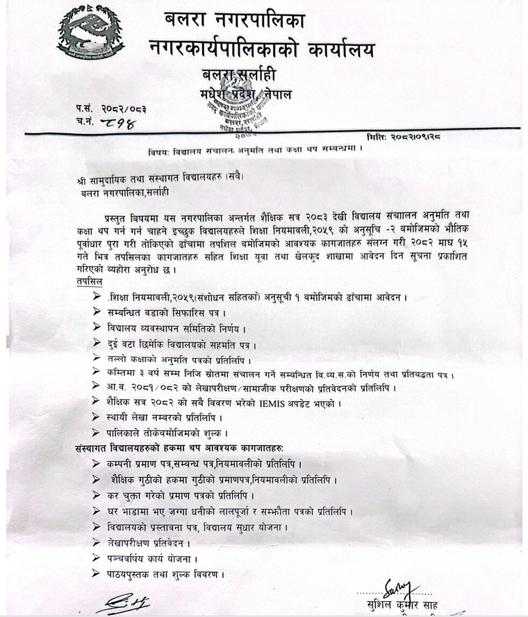 विद्यालय सञ्चालन अनुमति तथा कक्षा थप सम्बन्धी सूचना