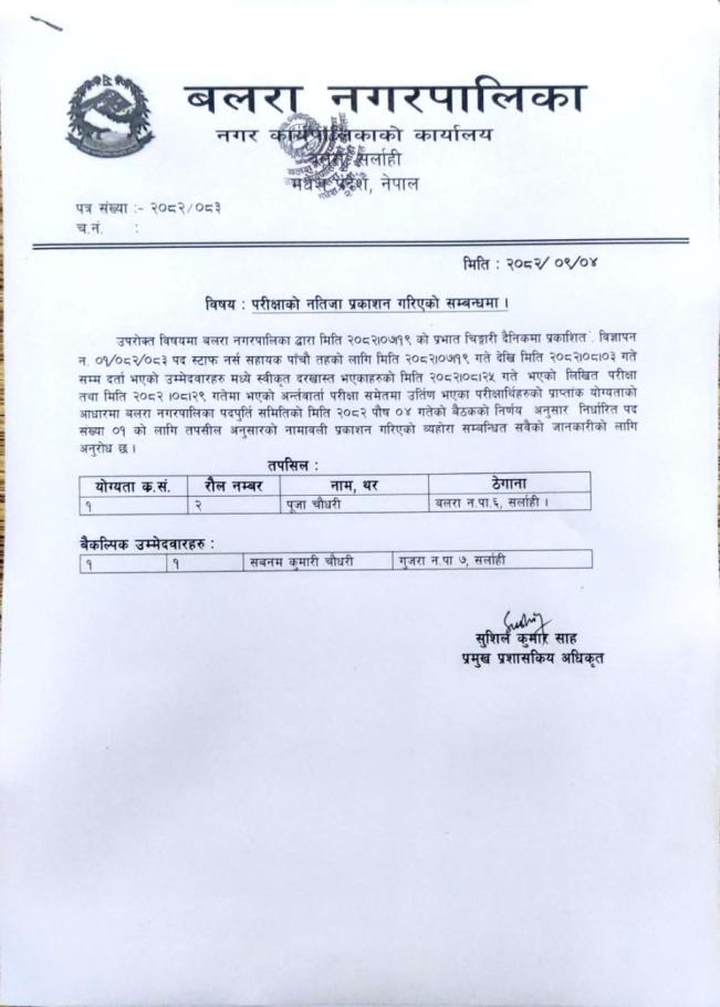 स्टाफ नर्स सहायक (पाँचौँ तह) पदको अन्तिम नतिजा प्रकाशन सम्बन्धी सूचना