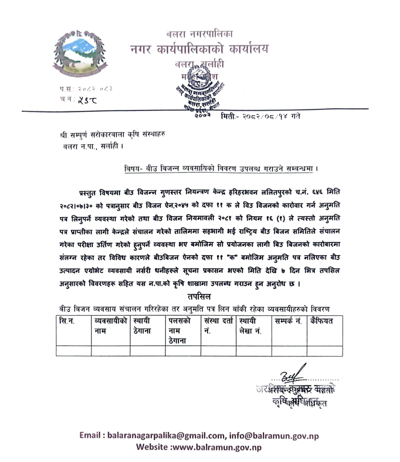 बीउ बिजन्न व्यवसायिको विवरण उपलब्ध गराउने सम्बन्धमा ।