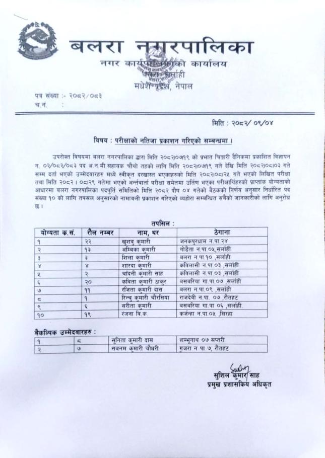 अ.न.मी. सहायक (चौथो तह) पदको अन्तिम नतिजा प्रकाशन सम्बन्धी सूचना