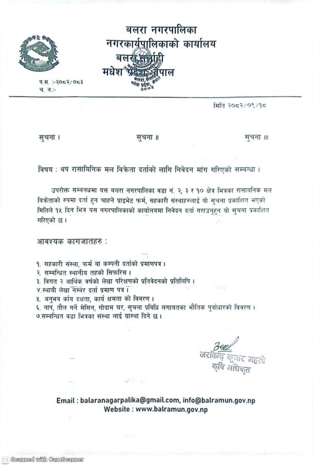 » वडा नं. २, ३ र १० का लागि रासायनिक मल विक्रेता दर्ता सम्बन्धी सूचना