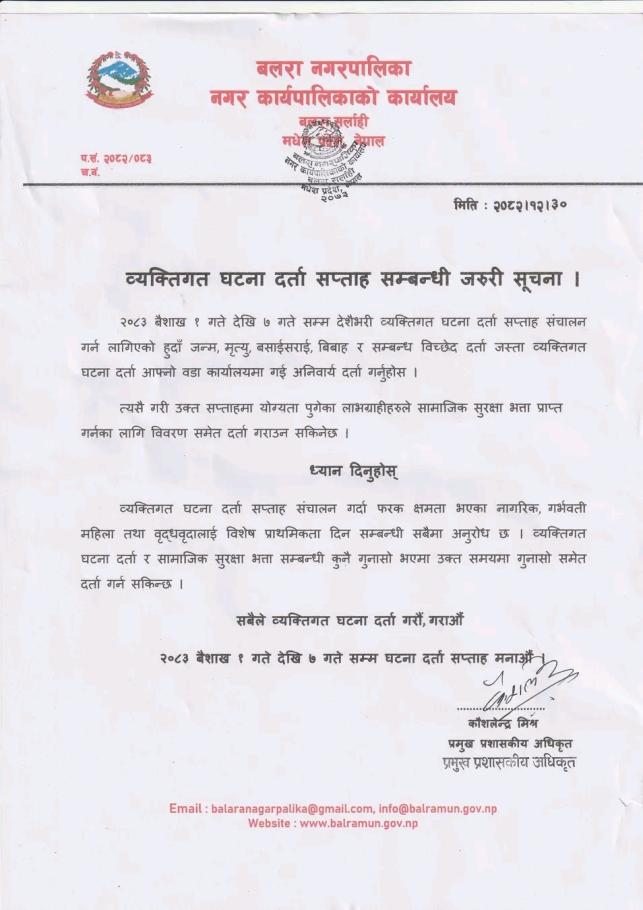 » व्यक्तिगत घटना दर्ता सप्ताह २०८३ साल बैशाख १ देखि ७ गतेसम्म