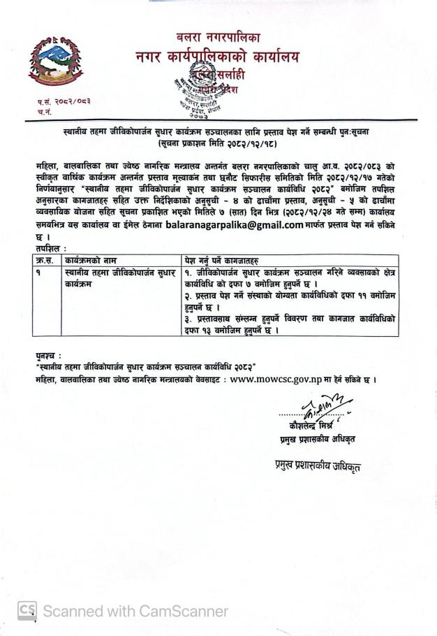 » स्थानीय तहमा जीविकोपार्जन सुधार कार्यक्रम सञ्चालनका लागि प्रस्ताव पेश गर्ने सम्बन्धी पुनःसूचना