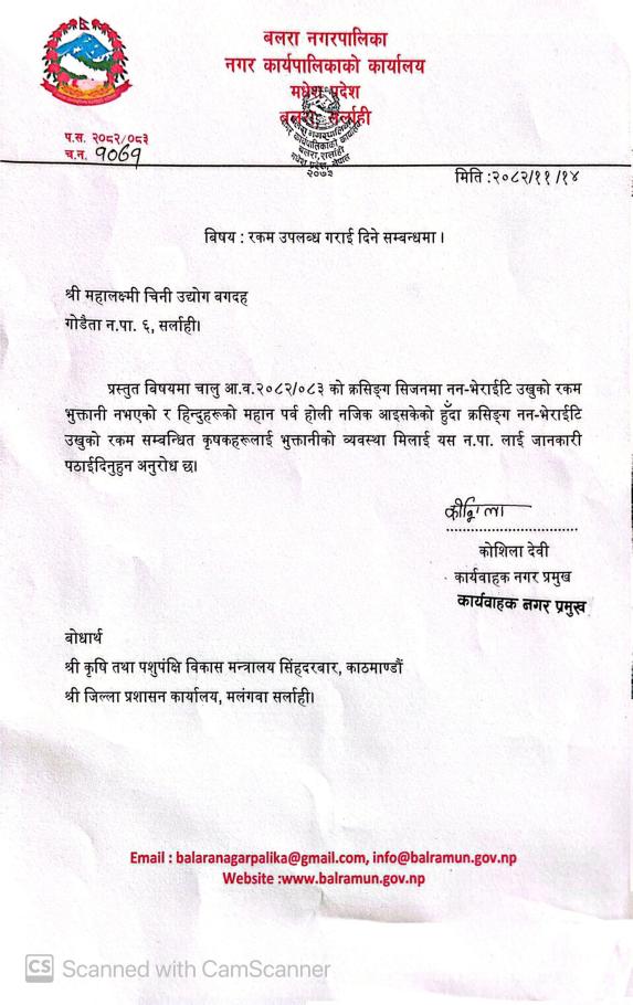 » क्रसिङ सिजनको उखु रकम शीघ्र भुक्तानी गर्न अनुरोध सम्बन्धी पत्र