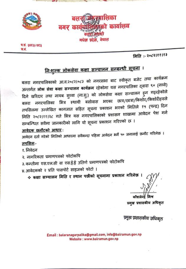 निःशुल्क लोकसेवा कक्षा सञ्चालन सम्बन्धी सूचना।