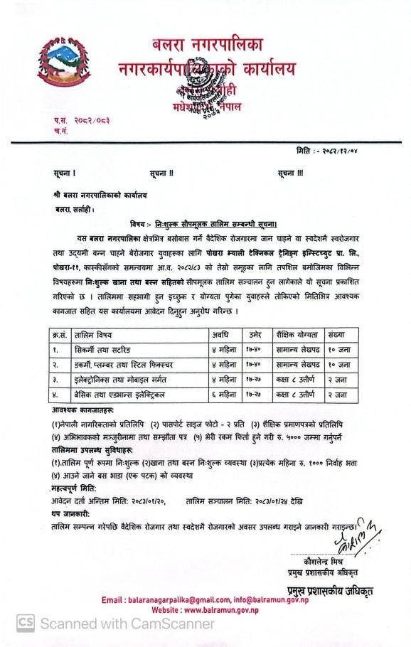 » निःशुल्क सीपमूलक तालिम सम्बन्धी सूचना।