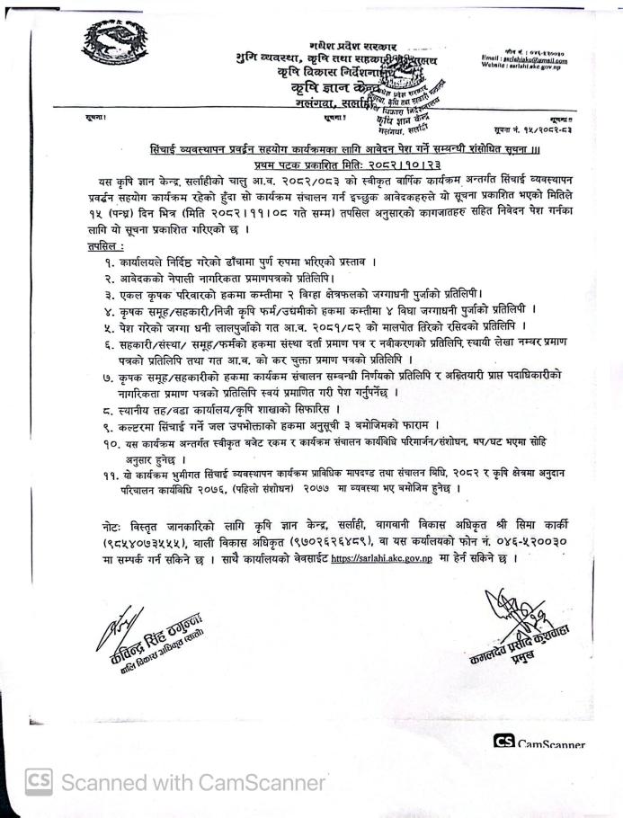 Home » सिंचाई व्यवस्थापन प्रवर्द्धन सहयोग कार्यक्रमका लागि आवेदन खुला। इच्छुक कृषक, समूह, सहकारी तथा कृषि उद्यमीहरूले आवश्यक कागजातसहित २०८२ फागुन ८ गतेभित्र निवेदन पेश गर्न सक्नुहुनेछ।
