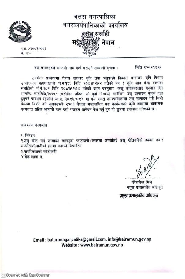 उखु कृषकहरुले आफनो नाम दर्ता गराउने सम्बन्धी सुचना ।